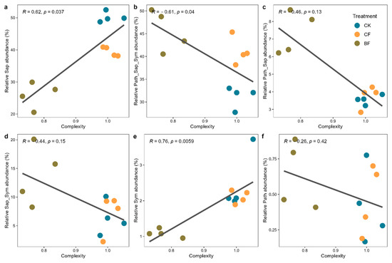 The shifting abundances of different functional guilds directly led to the reshaping of the entire fungal ecological network’s structure and stability. Network analysis showed that the complexity and stability of the fungal network were enhanced under the CF treatment, whereas the BF treatment significantly weakened the network structure (Figure 5). Our research and correlation analysis further confirmed that Sap and Sym are core structural groups, with their abundance being highly positively correlated with network complexity and robustness (R = 0.62–0.76, p < 0.05) (Figure 6a,e). This finding illustrates that the loss of key functional groups, particularly core decomposers and mutualists, directly undermines network stability.