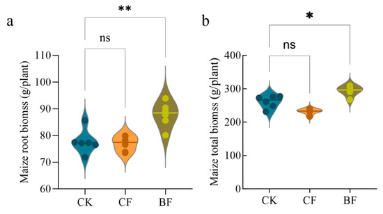 Effects of biodegradable and conventional polyethylene film residues on maize biomass. (a) Maize root biomass and (b) maize total biomass. Values are presented as the mean ± standard error (n = 6). CK (no mulch film application), CF (addition of PE film fragments); BF (addition of PLA + PBAT film fragments). * p < 0.05 and ** p < 0.01, ns indicates no significant difference.