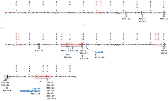 Amino acid (AA) sequence of KPC-2 according to Ambler numbering scheme [20]. Conserved Class A ß-lactamase canonical boxes are indicated in bolded red letters. Regions of AA changes associated with CAZ/AVI resistance are indicated by red boxes. Changed AAs, are highlighted by black boxes; the corresponding AA changes are indicated in blue, along with the KPC variant number in which they have been found. Sites of AA insertions are indicated by black lines, and deleted AAs are indicated by the Greek symbol Δ.