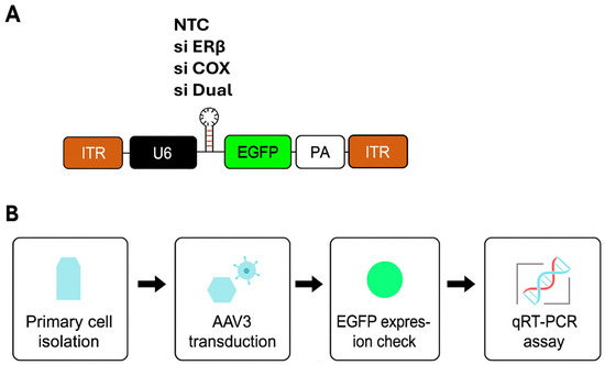 Schematic representation of the AAV3 vector backbone and experimental workflow. (A) AAV3 backbone design. All constructs contained inverted terminal repeats (ITRs) flanking a U6 promoter-driven siRNA cassette (NTC, siERβ, siCOX2, or siERβ + siCOX2, hereafter siDual) and a CMV promoter-driven EGFP reporter for tracking transduction efficiency, followed by a polyadenylation signal (PA). The NTC construct was used as the non-targeting control. (B) Experimental workflow. Primary endometrial cells were isolated and transduced with AAV3 vectors, followed by confirmation of EGFP expression and subsequent analyses including qRT-PCR and proliferation assays. AAV: adeno-associated virus; Erβ: Estrogen receptor β; COX2: cy-clooxygenase-2; CMV: cytomegalovirus; EGFP: enhanced green fluorescent protein; si Dual: siERβ + siCOX2; NTC: non-targeting siRNA cassette; qRT-PCR: quantitative reverse transcription polymerase chain reaction.