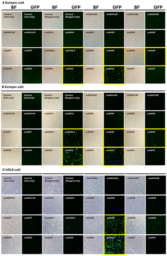 Self-complementary AAV vectors expressing enhanced green fluorescent protein (EGFP) were packaged into 14 conventional AAV serotypes. These were used to transduce eutopic and ectopic endometrial cells and the human granulosa-lutein 5 (hGL5) ovarian stromal cell line. Cells were plated to achieve 30–50% confluency at the time of transduction. AAV vectors were applied at a fixed multiplicity of infection (MOI; 1 × 1012 GC/mL) and incubated overnight, after which the medium was refreshed daily [11]. This MOI was chosen based on manufacturer recommendations and prior literature [19,20]. EGFP expression was analyzed by qRT-PCR and fluorescence microscopy 48 h post-transduction to determine relative infection efficiency and tissue tropism.