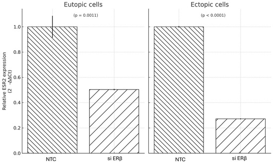 Primary eutopic and ectopic endometrial cells were transduced with siERβor NTC. Successful infection was confirmed by GFP fluorescence imaging, which demonstrated widespread intracellular delivery of the recombinant vector in both cell types. Quantitative RT-PCR analysis showed that ERβ expression was significantly reduced following siERβ transduction, with mRNA levels decreased to 49% of control values in eutopic cells (p = 0.0011) and 27% in ectopic cells (p = 0.000015), indicating statistically significant knockdown in both cell types (Figure 4).