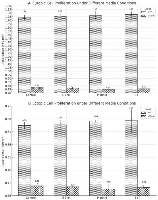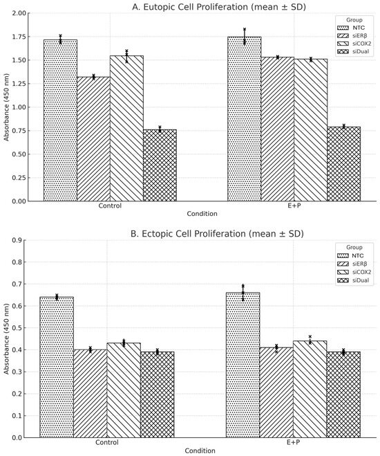 To evaluate the effects of ERβ and COX-2 gene suppression under various hormonal and inflammatory conditions, cell proliferation was assessed after transduction with siDual or NTC vectors across four media conditions: control, estradiol (E 1nM), prostaglandin E2 (P 10 nM), and combined E + P stimulation (Figure 6). In eutopic cells, absorbance values in the NTC group were 1.74 (control), 1.76 (E), 1.76 (P), and 1.78 (E + P), Corresponding siDual group values were 0.78, 0.77, 0.75, and 0.76. Although the siDual group showed consistently lower absorbance compared with NTC, one-way ANOVA revealed no statistically significant differences across conditions (p = 0.639 for NTC; p = 0.079 for siDual). Between-group comparisons indicated that siDual was significantly lower than NTC under all conditions (all p < 0.001). In ectopic cells, absorbance values were similarly stable across conditions, with NTC at 0.63–0.65 and siDual at 0.39–0.40. ANOVA again showed no significant differences within groups (p = 0.762 for NTC; p = 0.469 for siDual). However, siDual was consistently lower than NTC under every condition tested (all p < 0.001). Effect size estimates (Cohen’s d) for each knockdown group relative to the NTC are summarized in Supplementary Table S2.