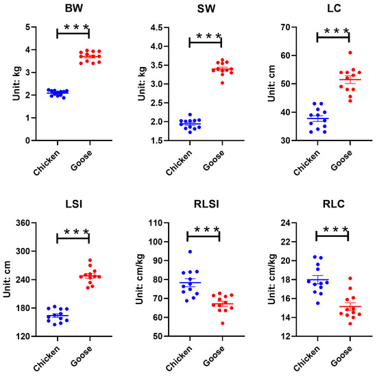 As evident from Figure 1, geese significantly outperform broilers in BW, SW, LSI, and LC, while underperforming in RLSI and RLC (p < 0.001).