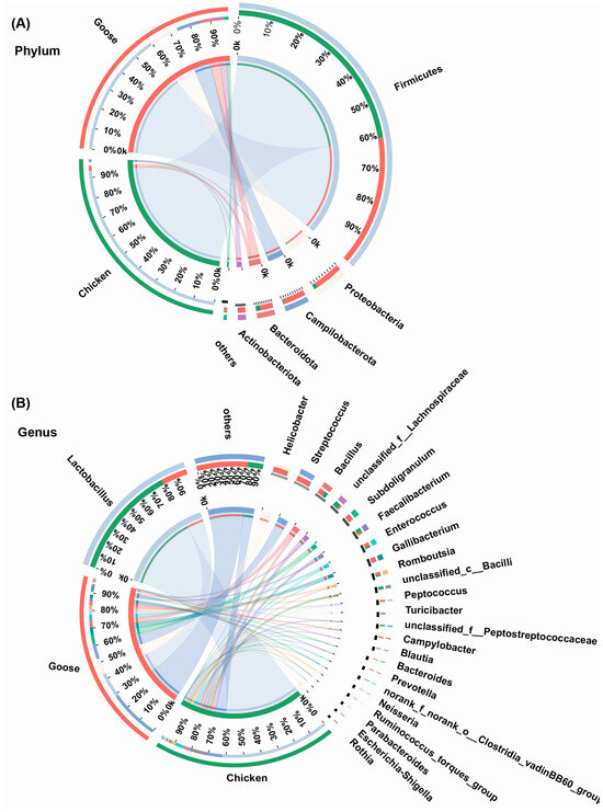 The community composition of chickens and geese gastrointestinal microbiota at phylum (A) and genus (B) levels. The color of the outer ring corresponds to the label beside it, while the color of the inner ring represents the proportion of its corresponding label within the respective outer ring.
