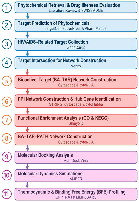 Network pharmacology, a modern systems biology framework, enables the mapping of complex interactions between phytochemicals and disease networks, moving beyond the traditional “one drug-one target” model. This approach is especially relevant in HIV cure research, where multifactorial host–pathogen interactions complicate therapeutic design. Although similar studies have applied network pharmacology to cancer [20], infectious diseases [21], and metabolic diseases [22], relatively few have leveraged this systems-level approach in HIV research [23]. In addition, integrative investigations focused on E. natalensis and HIV infection are currently lacking. This underscores the novelty and significance of our study in uncovering plant-based multi-target strategies for immune restoration and viral inhibition in the pathogenesis of HIV. Therefore, this study aimed to systematically investigate the therapeutic potential of E. natalensis in HIV pathogenesis by integrating systems pharmacology and molecular modeling approaches. Specifically, we combined absorption, distribution, metabolism, and excretion (ADME) profiling, host target mapping, protein–protein (PPI) analysis, gene ontology (GO) and Kyoto encyclopedia of genes and genomes (KEGG) enrichment, bioactive-target-pathway (BA-TAR-PATH) analysis, molecular docking, molecular dynamics (MD) simulations, and molecular mechanics/generalized Born surface area (MM/GBSA) binding free energy (BFE) calculations to identify and prioritize phytochemicals with favorable drug-like properties, uncover their putative host targets and HIV-relevant signaling pathways, and validate the stability and energetics of lead phytochemical–protein interactions.