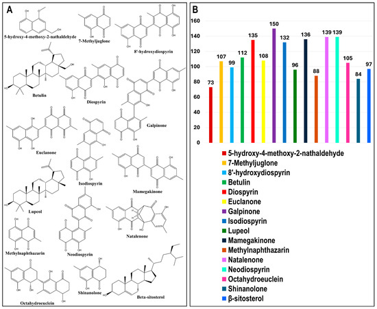Chemical structures and target prediction profiles of the Euclea natalensis phytochemicals. (A) The 2D chemical structures of the 16 reported phytochemicals isolated from E. natalensis root bark. (B) Bar chart showing the number of predicted protein targets per compound identified using three target prediction platforms (TargetNet, SuperPred, and PharmMapper). Each color represents a distinct phytochemical.