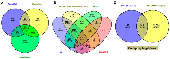 Target prediction and intersection of phytochemicals and HIV/AIDS-associated genes. (A) Venn diagram showing the overlap among the predicted protein targets of Euclea natalensis phytochemicals from TargetNet, SuperPred, and PharmMapper. (B) Overlapping HIV/AIDS-related target genes collected from GeneCards using four search terms: “HIV,” “Human Immunodeficiency Virus,” “AIDS,” and “HIV/AIDS.” (C) Common targets between predicted phytochemical targets and HIV/AIDS-related genes, resulting in 313 intersecting genes considered for further network analysis.