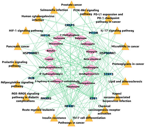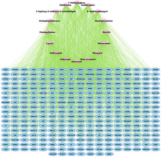 BAR-TAR interaction network of Euclea natalensis phytochemicals. The network representation illustrates the interactions (green edges) between 16 bioactive compounds from E. natalensis (pink nodes) and their predicted 313 human protein targets (blue nodes). The network emphasizes the polypharmacological profile of the phytochemicals, with several compounds interacting with multiple protein targets.
