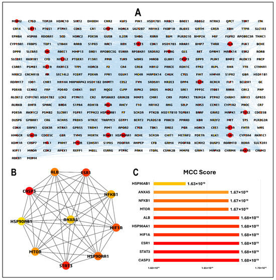 PPI network and hub gene analysis of overlapping HIV/AIDS-related targets. (A) PPI network constructed from the 313 overlapping targets of Euclea natalensis phytochemicals and HIV/AIDS-associated genes. Nodes represent protein targets, and the bigger red-highlighted nodes indicate the top-scoring hub genes. (B) Subnetwork of the top 10 hub genes ranked by MCC, visualized using CytoHubba. The node color (red to yellow) corresponds to the MCC score, with darker shades indicating higher centralities. (C) Bar plot of the top 10 hub genes sorted by MCC score. These genes are considered central regulators, suggesting their critical role in HIV/AIDS-related molecular pathogenesis.