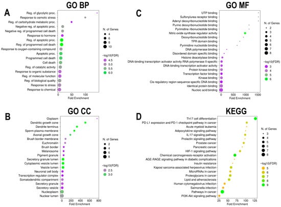 GO and KEGG pathway enrichment analysis of Euclea natalensis hub genes highlighting the top 20 enriched terms in bubble plots. (A) GO BP terms show enrichment in pathways, including regulation of glycolytic processes, stress response, and apoptotic regulation. (B) GO CC terms highlight localization in growth cones, plasma membranes, and secretory vesicles. (C) GO MF terms reveal enrichment in nucleotide binding, kinase binding, and transcription factor activity. (D) KEGG pathway analysis identified signaling pathways related to immunity, inflammation, infection, cancer, and metabolic disease, including Th17 differentiation, PD-1/PD-L1 checkpoint, IL-17 signaling, HIF-1 signaling, and PI3K-Akt signaling pathways. Dot sizes indicate the number of enriched genes per term, and the color scale represents statistical significance as −log10(FDR).