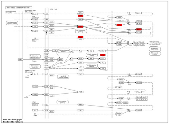 A total of 123 KEGG pathways were significantly enriched. Many of the enriched pathways were immunological or oncogenic, reflecting host–pathogen interplay during HIV infection and its associated immune dysregulation (Figure 6D). The most enriched pathway was Th17 cell differentiation (KEGG ID: hsa04659; FE = 127.12), which involved six hub genes (MTOR, HIF1A, HSP90AA1, HSP90AB1, NFκβ1, and STAT3) (Figure 7). Other key immune pathways included PD-L1/PD-1 checkpoint pathway in cancer (hsa05235; FE = 102.84) and IL-17 signaling pathway (hsa04657; FE = 98.41). Oncogenic and immune-metabolic signaling pathways also featured prominently, such as HIF-1 signaling pathway (hsa04066), AGE-RAGE signaling in diabetic complications (hsa04933), and PI3K-Akt signaling pathway (hsa04151). These were enriched by combinations of MTOR, STAT3, CASP3, HIF1A, and NFκβ1. Viral infection-related pathways, such as Kaposi sarcoma-associated herpesvirus infection (hsa05167; FE = 58.97) and human cytomegalovirus infection (hsa05163; FE = 40.86), were enriched with MTOR, NFκβ1, STAT3, and CASP3. Notably, pathways in cancer (hsa05200; FE = 34.54) was the most gene-dense, involving eight hub genes, which is consistent with the hyperactivation of oncogenic signaling in chronic HIV infection and immune evasion (Table S6). Furthermore, the human immunodeficiency virus 1 (HIV-1) infection pathway (hsa05170) was significantly enriched with overlapping genes including PAK4, CHEK1, CHUK, MAPK14, PTK2B, MTOR, TBK1, NFκβ1, MAPK1, MAPK8, MAPK10, RAC1, RELA, APOBEC3G, CALM1, CALM3, CASP3, CASP9, CDK1, and CDC25C (Figure S3).