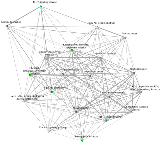KEGG pathway–pathway enrichment network plot. Nodes represent the top 20 significantly enriched KEGG pathways. The node size corresponds to the size of each gene set, and the color (green) intensity reflects the statistical significance (FDR-adjusted p-values), with darker nodes indicating more significant enrichment. Edges represent ≥ 20% gene overlap between pathways; thicker edges indicate a higher gene overlap.