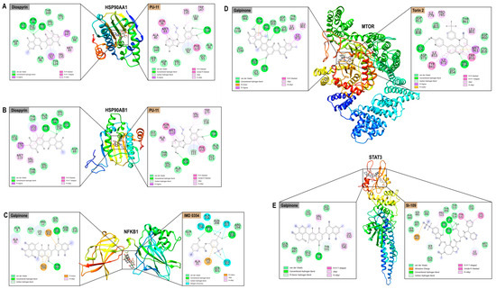 Comparative molecular docking analysis illustrating the binding interactions of the two top-ranked Euclea natalensis phytochemicals (diospyrin and galpinone, tan-colored) and their corresponding reference inhibitors (PU-11, IMD 0354, Torin 2, SI-109; slate gray) within the top-ranked hub HIV-associated host proteins. (A) HSP90AA1–Diospyrin vs. PU-11, (B) HSP90AB1–Diospyrin vs. PU-11, (C) NFκβ1–Galpinone vs. IMD 0354, (D) MTOR–Galpinone vs. Torin 2, and (E) STAT3–Galpinone vs. SI-109. The 2D interaction diagrams (left and right) show hydrogen bonds, hydrophobic contacts, and van der Waals interactions. Protein structures (center) are rainbow-colored by domain, with N-termini in blue and C-termini in red, illustrating the spatial orientation of ligand binding within the active site of each protein.