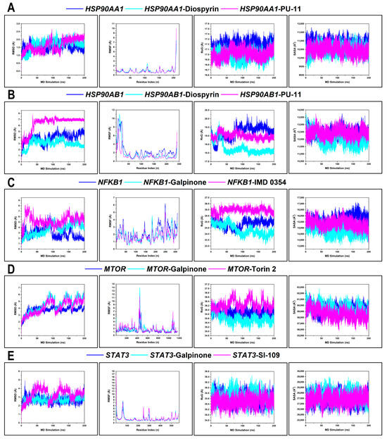 The conformational changes of the hub targets (HSP90AA1, HSP90AB1, NFκB1, MTOR, and STAT3) were assessed via RMSD, RMSF, RoG, and SASA (Table S10). The mean RMSD value of HSP90AA1, HSP90AA1–Diospyrin, and HSP90AA1–PU-11 was 1.53 Å, 1.67 Å, and 1.64 Å, respectively. Unbound HSP90AA1 exhibited relatively stable RMSD fluctuations (~1.5 Å), with both ligated systems maintaining this stability throughout the simulation. However, PU-11 induced slightly higher RMSD excursions in the final 50 ns. The mean RMSF value of HSP90AA1, HSP90AA1–Diospyrin, and HSP90AA1–PU-11 was 0.89 Å, 0.92 Å, and 0.88 Å, respectively. RMSF plots confirmed minor per-residue fluctuations (< 2 Å), with the C-terminal region being more mobile. The average RoG value of HSP90AA1, HSP90AA1–Diospyrin, and HSP90AA1–PU-11 was 17.17 Å, 16.97 Å, and 17.01 Å, respectively. Thus, protein compactness remained tightly clustered (~17 Å) for all systems. Furthermore, the mean SASA value of HSP90AA1, HSP90AA1–Diospyrin, and HSP90AA1–PU-11 was 10,775.99 Å2, 10,467.41 Å2, and 10,467.00 Å2, respectively. The lower SASA in both ligand-bound systems indicates a more compact folding due to ligand-induced hydrophobic stabilization (Figure 11A).
