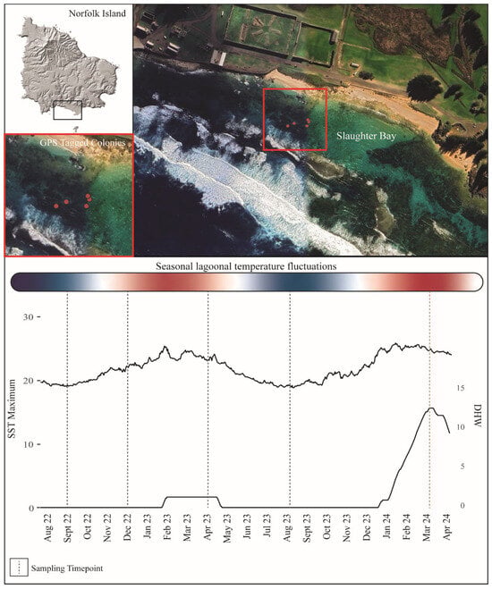This study was based within the shallow-water (<5 m) lagoonal reefs of the Norfolk Island Marine Park (Slaughter Bay, 29°3.5454′ S, 167°57.4434′ E) (Figure 1). Environmental data, including sea surface temperatures, were obtained from the National Oceanic and Atmospheric Administration (NOAA, 2024 [30]) satellite data (Table S1).