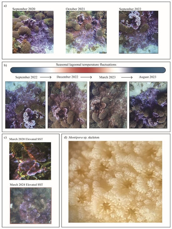 (a) Historic images of blue Montipora sp. from September 2020, October 2021, and September 2022 (images by Susan Prior, with permission). (b) Montipora sp. imaged over 4 timepoints within this study demonstrating colour variation with seasonality, with temperature fluctuations visualised in the heat bar above. (c) Images of Montipora sp. taken within the March 2024 bleaching event in Norfolk Island’s lagoonal reef system, demonstrating patchy fluorescence. A similar response is observed in photos obtained from March 2020 under elevated SST (images by Susan Prior, with permission). (d) A skeletal image of blue Monitpora sp.