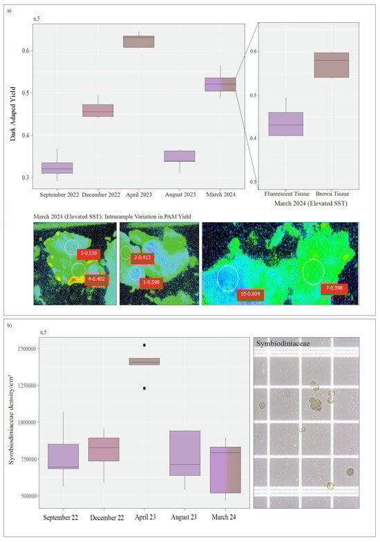 (a) Dark adapted pulse amplitude modulation fluorometry of Montipora sp. within Norfolk Island’s lagoonal reef across 5 timepoints, including a bleaching event in March 2024 indicated in red. Montipora sp. demonstrated significant variation in photosynthetic yield over time, with yield decreasing in the winter or spring transitional months and increasing into late summer. Montipora sp. had a patchy bleaching response in March 2024 (i.e., patches of fluorescent tissue and brown tissue) which resulted in significant variation in photosynthetic yield across the colony. (b) Symbiodiniaceae densities were observed to significantly increase in April 2023. The March 2024 bleaching event demonstrated comparatively lower Symbiodiniaceae densities when compared to previous similar timepoints (April 2024).
