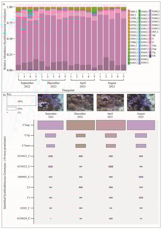(a) Symbiodiniaceae genotypes identified for Montipora sp. within Norfolk Island’s lagoonal reefs by targeting internal transcribed spacer 2 (ITS2) nuclear ribosomal DNA region using Symbiodiniaceae specific primers across 4 timepoints. Montipora sp. associate with Cladocopium genotypes. C3aap was the predominant genotype identified followed by C3ig and C3aao. A large array of less prominent genotypes are also shown in association. (b) Colonies are grouped by timepoint to demonstrate minimal variability in the associated genotypes over time.