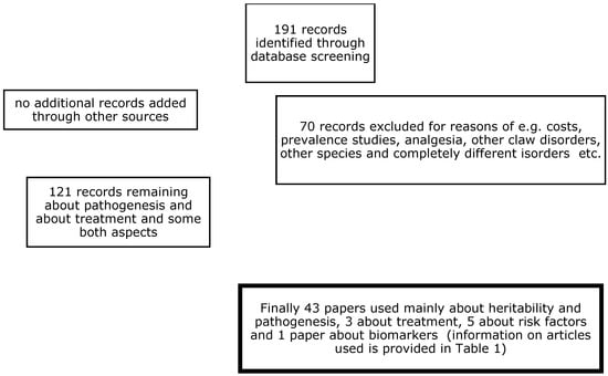 Articles from countries with modern dairy production systems were selected, where lameness was related to claw horn lesions and more specific to WLD in zone 3 and TTN in zone 1. A preliminary database search for scientific articles (described below) returned 43 papers related to the pathogenesis of these disorders and 6 papers related to their treatment, with nearly all being from Western countries. This comprehensive literature search was conducted in 2025 to identify relevant studies involving white line and toe necrosis lesions in dairy cows. The search terms included “white line”, “pathogenesis”, or “treatment”, and “dairy cows” in the title, in the abstract, and/or as a keyword. The listed search terms were entered into three databases: