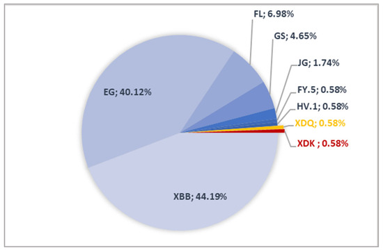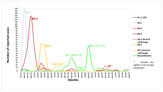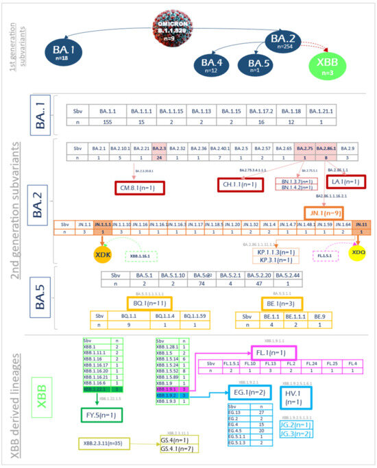Considering second-generation subvariants, a total of 107 were identified (Figure 2). Within BA.1, the detected lineages included BA.1.1, BA.1.1.15, BA.1.1.18, BA.1.1.20, BA.1.1.21, and BA.1.1.11. BA.2 comprised BA.2.1, BA.2.3, BA.2.5, BA.2.7, BA.2.10.1, BA.2.10.2, BA.2.12, BA.2.27, BA.2.57, BA.2.75, BA.2.86.1, and BA.2.86.3, along with derived lineages such as JN.1.*, JN.11, LA.1, BN.1.*, CM.8.1, CH.1.1, and KP.*. As for BA.5, its sub-lineages were BA.5.1, BA.5.1.2, BA.5.2.20, BA.5.2.44, BE.1.*, BE.9, and BQ.1.*. The XBB lineage encompassed XBB.2.3.11, XBB.1.5.*, XBB.1.9.*, XBB.1.11, XBB.1.16, XBB.1.22, and XBB.1.28, as well as EG.*, FY.5, FL.*, JG.*, HV.1, and GS.4.*. Additionally, XDQ and XDK were detected (Figure 2).