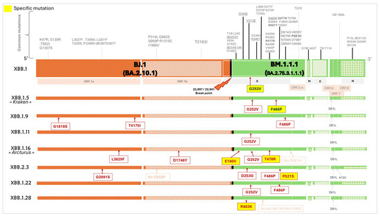 Schematic overview of the genomic structure and characteristic mutations of major Omicron XBB lineages identified in Tunisia. The top panel shows the genome organization of XBB.1 with annotated ORFs. It illustrates its origin from BJ.1 (orange stripes) and BM.1.1.1 (green checks), with a breakpoint at position 22,887–22,941 in the spike gene. The bottom panels show XBB.1 derivatives. Common mutations are shown in gray, lineage-defining mutations are highlighted in yellow, additional mutations are annotated in red, and absence of mutation is indicated in pink. Data from GISAID [16] and outbreak info (https://outbreak.info/) (accessed on 25 March 2025).