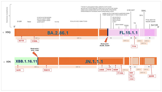 Schematic overview of the genomic structure and characteristic mutations of major Omicron XDA lineages identified in Tunisia. The top panel shows the genome organization of XDQ with annotated ORFs. It illustrates its origin from BA.2.86.1 (orange) and FL.15.1.1 (pink), with a breakpoint at position 25,528–25,581 in the spike gene. The second panel shows XDK with annotated ORFs. It illustrates its origin from XBB.1.16.11 (green) and JN.1.1.1 (orange), with a breakpoint at position 5315–6182 in the ORF.1. a. Common mutations are shown in gray; additional mutations are annotated in red. Data from GISAID [16] and outbreak info (https://outbreak.info/) (accessed on 25 March 2025).