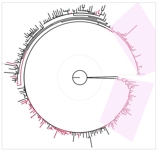 Maximum Likelihood phylogenetic tree of SARS-CoV-2 Omicron BA.2 subvariant, constructed using IQ-TREE. Red branches correspond to Tunisian sequences, and black branches correspond to worldwide sequences. Tunisian exclusive clusters are highlighted in pink. The tree is rooted using the Wuhan reference sequence (NC_045512) as an outgroup.