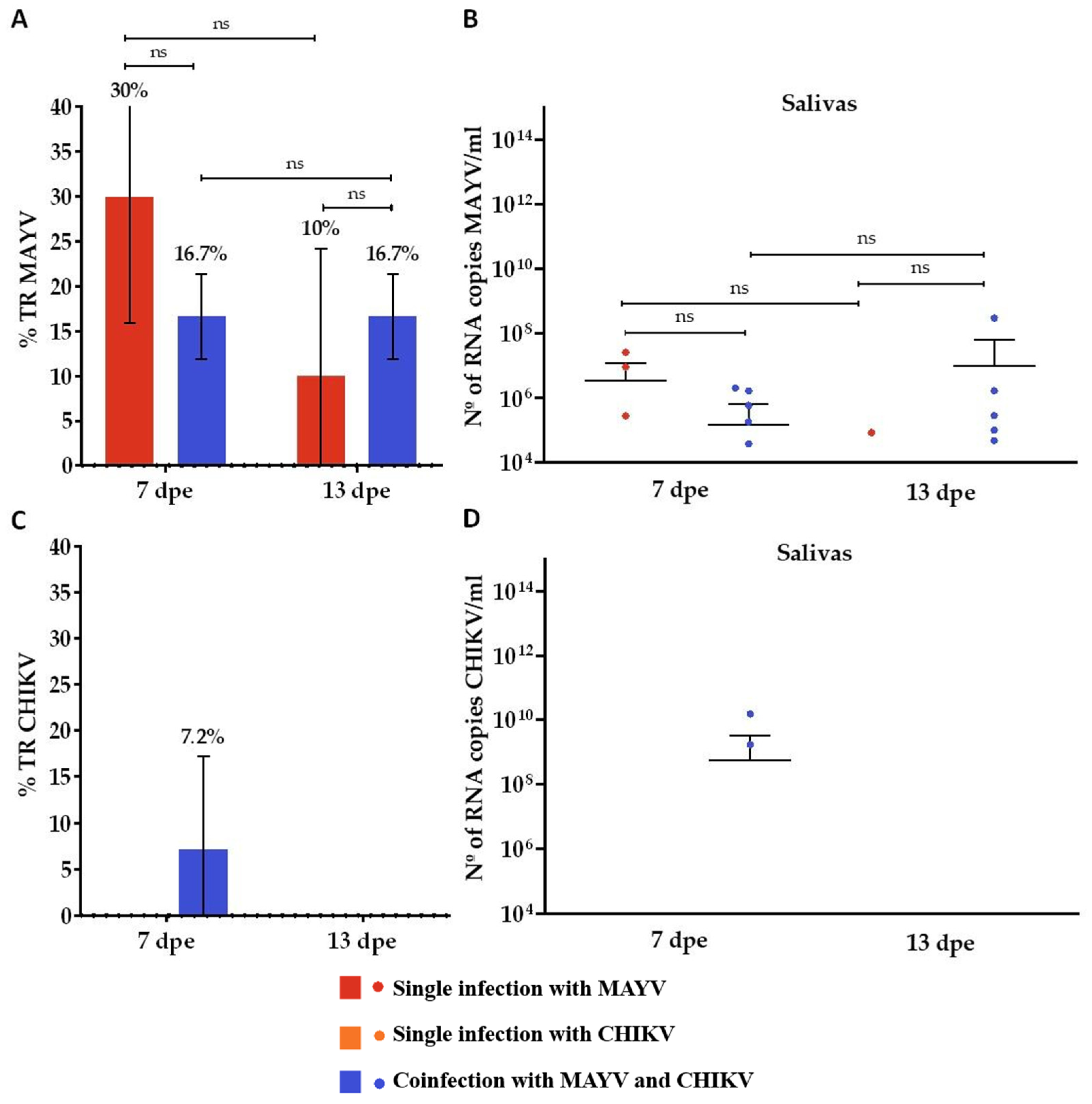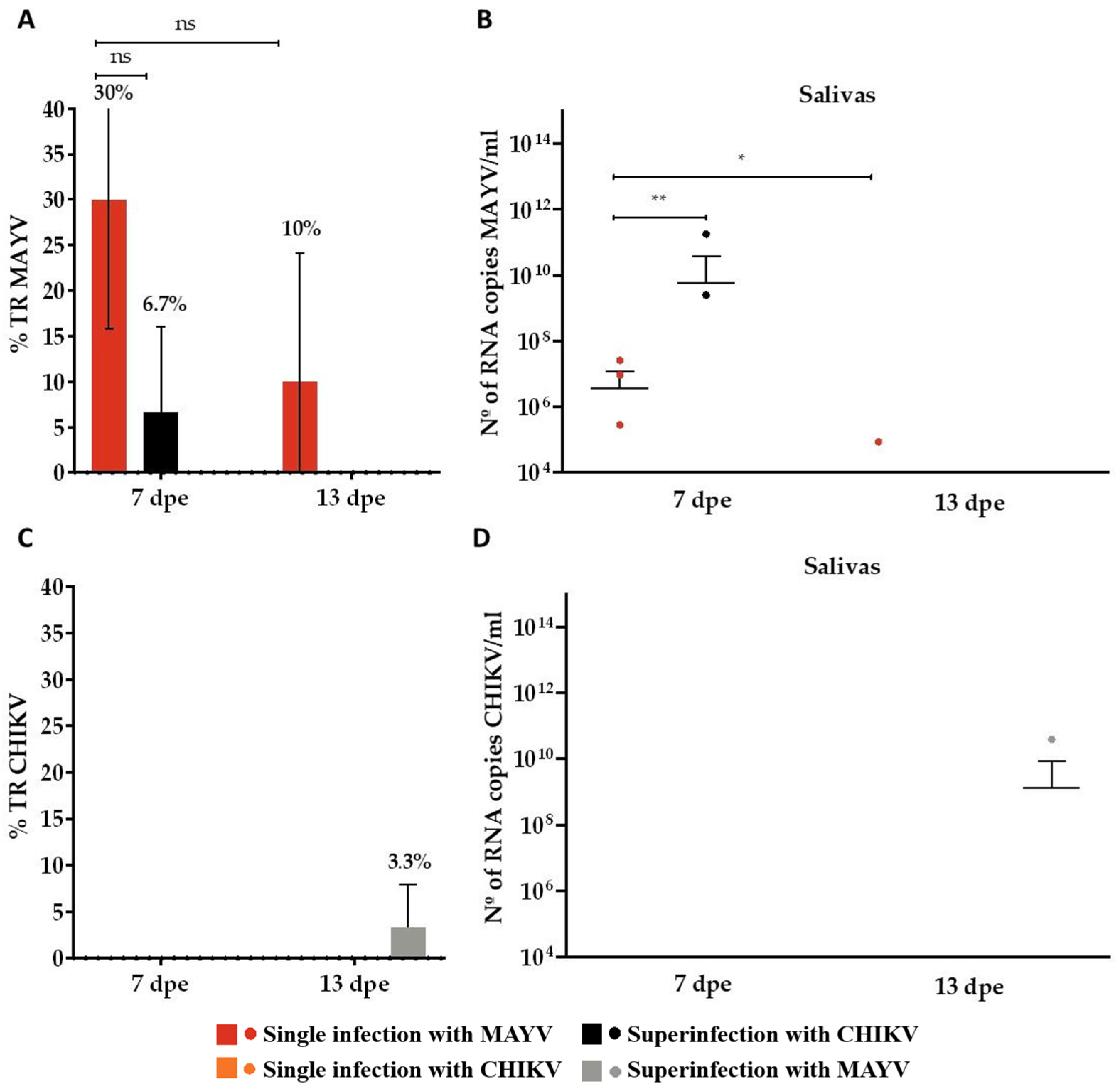Coinfection MAYV + CHIKV | MAYV | 5.5 × 107 | - * |
