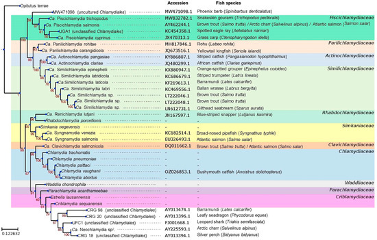 Members of the Chlamydiota order, which cause epitheliocystis, were described based on the sequencing of their 16S rRNA gene and were classified in eight different family-level lineages: Parachlamydiaceae, Simkaniaceae, Rhabdochlamydiaceae, Candidatus (Ca.) Similichlamydiaceae, Ca. Clavichlamydiaceae, Ca. Piscichlamydiaceae, Ca. Parilichlamydiaceae, and Ca. Actinochlamydiaceae. In addition, a few species are still unclassified (see Table 1 and Figure 1) [30].