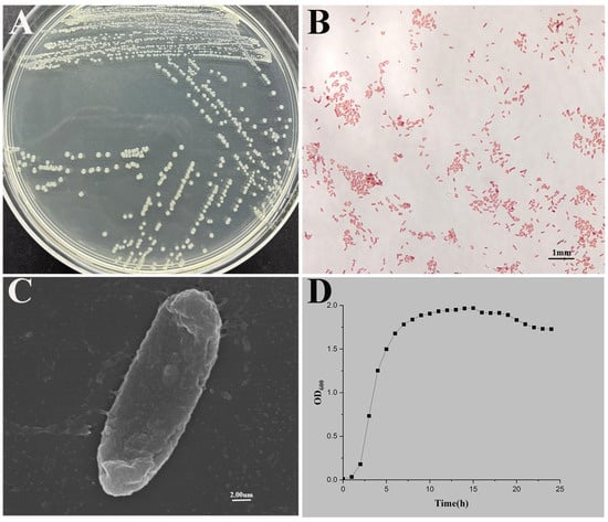 P. shigelloides strain CA-HZ1 isolation and identification. (A) Colony morphology on LB agar. (B) Gram staining for strain CA-HZ1 under light microscopy. (C) Scanning electron microscopy (20,000×). (D) Growth curves of strain CA-HZ1 at 28 °C.