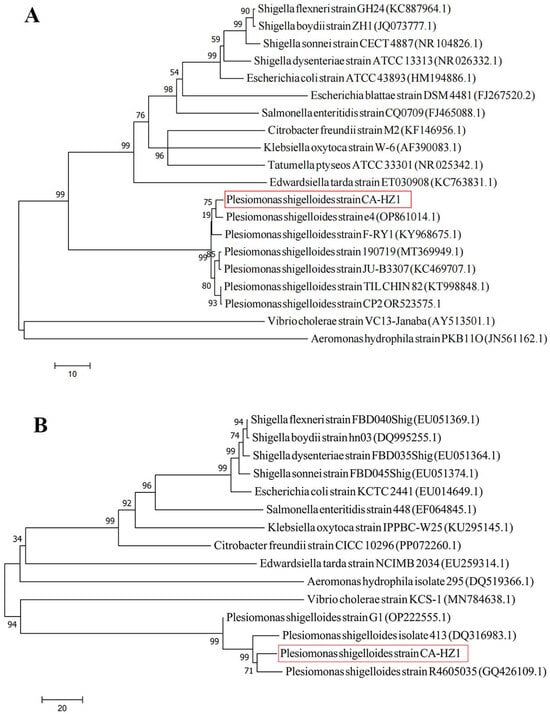 (A) Phylogenetic trees according to 16S rRNA sequence. (B) Phylogenetic trees according to gyrB sequence. Numerals at nodes are indicative of bootstrap percentages obtained based on 1000 replications. Numbers after species names represent GenBank accession numbers. The P. shigelloides CA-HZ1 strain is highlighted with a red frame in the figure.