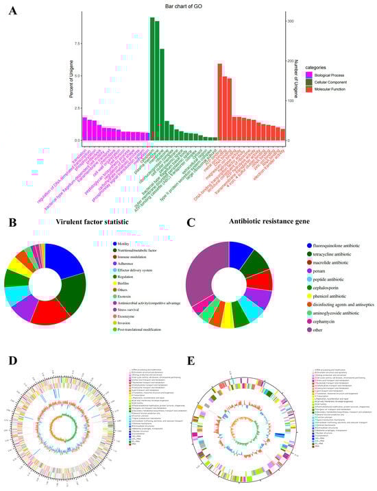 Whole-genome sequencing and genome annotation. (A) Gene Ontology (GO) slim classification. (B) Virulent factor. (C) Antibiotic resistance gene. (D) Chromosome Circos map of P. shigelloides CA-HZ1. (E) Circos diagram of plasmid architecture.