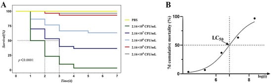 We analyzed cumulative survival rates in control and infection groups (Figure 4A). The mortality of the infection group was observed at 1 dpi under the greatest concentration gradient, with mortality increasing from 50% to 96.7% during 1–4 dpi. At the injection titer exceeding 2.7 × 107 CFU/mL, mortality surpassed 50% in every group. The 7-day lethality profile of P. shigelloides in C. argus yielded LD50 (Figure 4A) and LC50 (Figure 4B) values of 1.83 × 104 CFU/g and 2.22 × 106 CFU/mL, respectively.