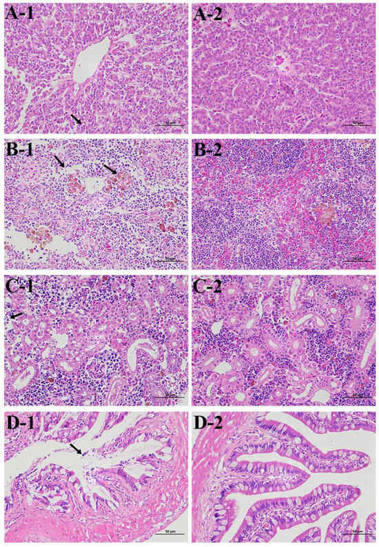 Histological sections for tissues from C. argus after P. shigelloides infection. (A-1) Infected liver (black arrow indicates loose cytoplasm in hepatocytes). (A-2) Uninfected liver. (B-1) Infected spleen (black arrow indicates decreased lymphocytes). (B-2) Uninfected spleen. (C-1) Infected kidney (black arrow indicates decreased lymphocytes). (C-2) Uninfected kidney. (D-1) Infected intestine (black arrow indicates shedding of epithelial cells in the mucosal layer). (D-2) Uninfected intestine; scale bar = 100 μm.
