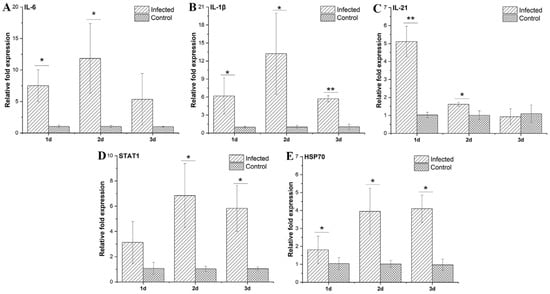 Immune-related gene patterns in C. argus liver at diverse times following P. shigelloides infection detected through qRT-PCR. (A) IL-6, (B) IL-1β, (C) IL-21, (D) STAT1, (E) HSP70. One-way ANOVA was used for statistical analysis (p > 0.05, non-significance; p < 0.05 (*), significance; p < 0.01 (**), extreme significance).