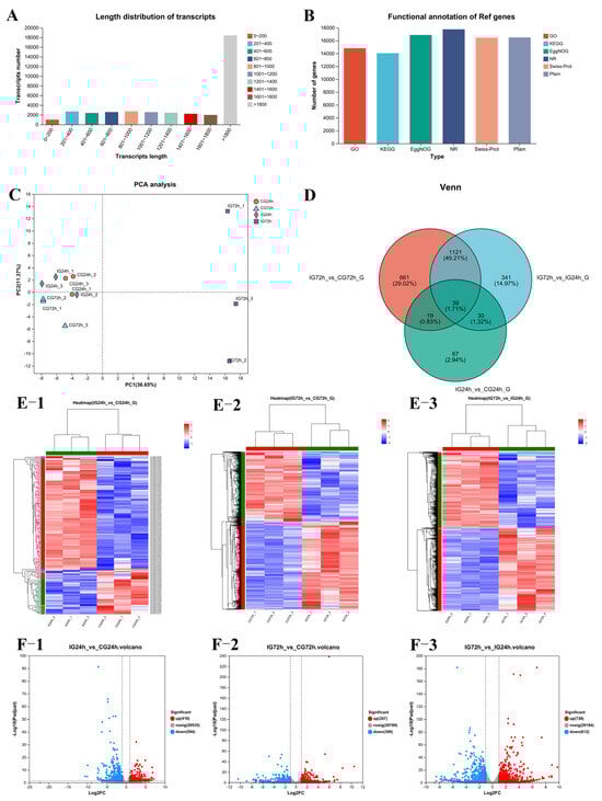 (A) Sequence length distribution. The length range of unigenes is represented by the abscissa; the number of unigenes within this range is shown by the ordinate. (B) Statistics on functional annotations for six distinct databases. The database name is shown by the abscissa, and the number of sequences annotated to the database is shown by the ordinate. (C) PCA of gene expression in different groups. (D) Venn diagram of the DEGs. (E) Cluster analysis of gene expression patterns: (E-1) IG24h vs. CG24h; (E-2) IG72h vs. CG72h; (E-3) IG72h vs. IG24h; (F) Volcano plot of differentially expressed genes; (F-1) IG24h vs. CG24h; (F-2) IG72h vs. CG72h; (F-3) IG72h vs. IG24h.