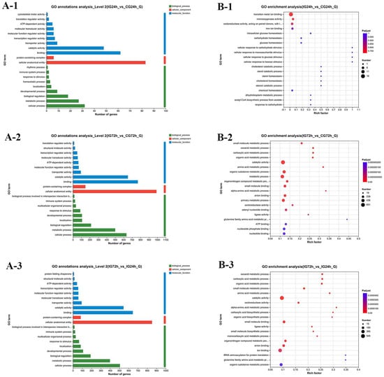 GO term. (A) GO classification of DEGs: (A-1) IG24h vs. CG24h; (A-2) IG72h vs. CG72h; (A-3) IG72h vs. IG24h. (B) Bubble diagram of the TOP 20 significantly enriched GO terms: (B-1) IG24h vs. CG24h; (B-2) IG72h vs. CG72h; (B-3) IG72h vs. IG24h.