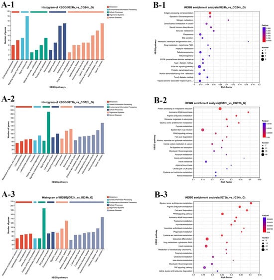 KEGG pathway. (A) KEGG pathway enrichment analysis of the DEGs: (A-1) IG24h vs. CG24h; (A-2) IG72h vs. CG72h; (A-3) IG72h vs. IG24h. (B) Bubble diagram of the TOP 20 significantly enriched KEGG pathways: (B-1) IG24h vs. CG24h; (B-2) IG72h vs. CG72h; (B-3) IG72h vs. IG24h.