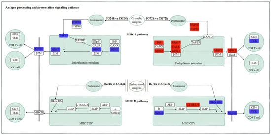 In P. shigelloides-infected C. argus, DEGs were predominantly enriched in innate immunity pathways, particularly genes involved in PRR-mediated signaling cascades, including MAPK, antigen processing and presentation, and PI3K-Akt pathways. KEGG enrichment analysis confirmed significant activation of antigen processing and presentation pathway-associated genes at both 24 h and 72 h post-infection (Figure 10). This pathway can be divided into two subpathways: the MHCI pathway and the MHCII pathway. There were six DEGs related to antigen processing and presentation at 24 h after infection, including HSP70, TAP1/2, MHCI, etc. Among them, TAP plays a central role in MHC I antigen presentation, while HSP70 acts in an ATP-dependent manner and has been shown to be involved in immune stimulation, stress tolerance, and defense against bacterial invasion. There were 20 DEGs related to antigen processing and presentation at 72 h after infection, including MHCII, HSP90, CALR, BiP, CTSB/L/S, etc. Both the REP57 and CALR genes are present in the endoplasmic reticulum. ERP57 is involved in the assembly of major histocompatibility complex (MHC) class I molecules and regulates the immune response. These DEGs indicate that P. shigelloides invasion triggers activation of the antigen processing and presentation pathway, a core element of the robust innate immune response mounted by C. argus.