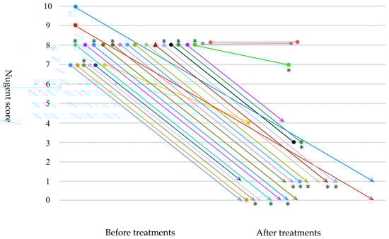 Changes in Nugent scores, BV-FS A/B criteria before and after treatments with metronidazole in 25 women with classical BV (Nugent score ≥7). ● Bacterial vaginosis–Flora select™ (BV-FS) A criterion. ▲ Bacterial vaginosis–Flora select™ (BV-FS) B criterion. ∗ Ureaplasma-positive.