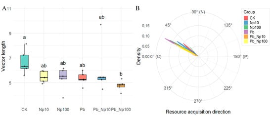 Differences in vector length (A) and vector angle (B) at the end of litter decomposition under different treatments. Different lowercase letters denote statistically significant differences (p < 0.05, Duncan’s test) among treatments.