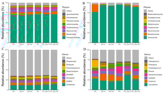 At the phylum level, Pseudomonadota overwhelmingly dominated the bacterial community across all treatments, and no significant differences were observed in relative abundance profiles among treatments (Figure 4A). Among fungi, Ascomycota was the dominant phylum. In the control (CK), Basidiomycota also constituted a substantial proportion (>20%); however, treatments with Pb, NP, or their combined exposures significantly reduced the relative abundance of Basidiomycota (Figure 4B). At the genus level, Acidibacter predominated in the bacterial community. Consistent with the phylum-level pattern, bacterial genus-level relative abundances showed minimal variation across treatments (Figure 4C). Conversely, the fungal community, primarily dominated by the genus Cercophora in all treatments, exhibited considerably greater variation among treatments. Specifically, all experimental treatments significantly increased the relative abundance of Fusarium while markedly decreasing that of Chaetospermum relative to the control (Figure 4D).