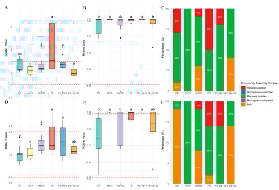 Microbial community assembly for bacteria (A–C) and fungi (D–F) at the end of litter decomposition under different treatments. Different lowercase letters indicate significant differences among different treatments (p < 0.05, Dunn’s test).