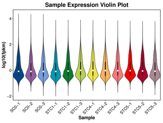 Gene expression levels, calculated as FPKM, were visualized via violin plots (Figure 1). The symmetric distribution of expression values across control and treatment groups indicated a normal distribution within the cellular population.