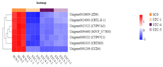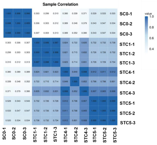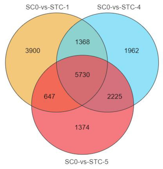 The correlation heat map (Figure 2) revealed that within the SC0 group, intra-group repeatability exceeded 0.9, while correlations with samples from the other three groups remained below 0.6. All samples across the STC1, STC4, and STC5 groups showed correlations above 0.7. Furthermore, within the STC1 and STC5 groups, intra-group correlations surpassed 0.9. Overall, this indicates a distinct difference in gene expression patterns between the control and treatment groups.