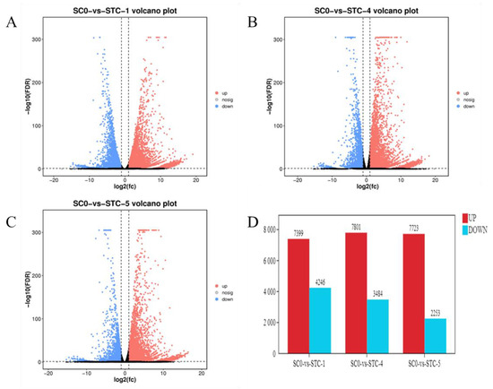 Differentially expressed gene statistics. (A): SCO-vs.-STC1; (B): SC0-vs.-STC4; (C): SC0-vs.-STC5; (D): statistical graph of the number of differentially expressed genes.