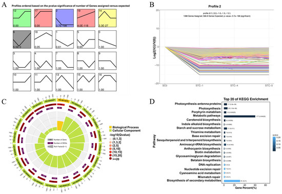 Using STEM software version 1.3.13, trend analysis was performed on all differentially expressed genes from the SC0-vs.-STC1-vs.-STC4-vs.-STC5 comparisons. As shown in Figure 5, a total of 20 trend modules were generated, among which 6 were identified as statistically significant. These included Module 12 (1675 genes), exhibiting an initial stable trend followed by an increase and subsequent stabilization; Module 17 (6284 genes), showing an early increase followed by stabilization; Module 2 (1398 genes), demonstrating an initial decrease followed by stabilization; Module 19 (1069 genes), displaying a continuously increasing expression trend over time; Module 14 (968 genes), characterized by an initial increase, a mid-term decrease, and eventual stabilization; and Module 6 (608 genes), exhibiting an initial decrease followed by a subsequent increase over time. Based on the research objectives, Module 2 was selected for further emphasis.