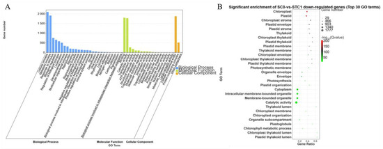GO enrichment analysis of SC0-vs.-STC1 downregulated differential genes. (A): SC0-vs.-STC1 downregulation of DEGs GO-enriched secondary classification; histogram (B): SC0-vs.-STC1 downregulation of DEGs GO significantly enriched bubble plot.