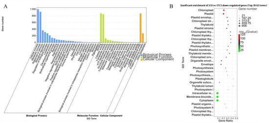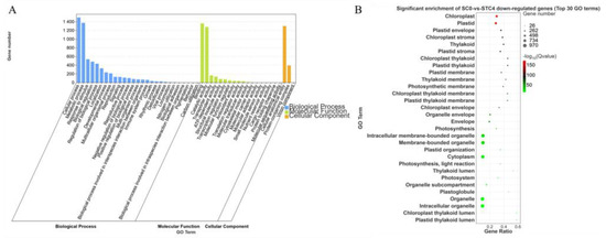 The downregulated DEGs from the comparison SC0-vs.-STC4 were annotated into 48 subcategories. Within the Biological Process category, the subcategories of cellular process and metabolic process contained the highest number of annotated genes, with 1499 and 1375 genes, respectively. Under the Molecular Function category, the subcategories binding and catalytic activity had the largest number of annotated genes, with 1364 and 1279, respectively. In the Cellular Component category, the subcategory cellular anatomical entity was assigned the most genes, totaling 1303. These downregulated DEGs were significantly enriched in functional terms related to chloroplast and plastid (Figure 7).